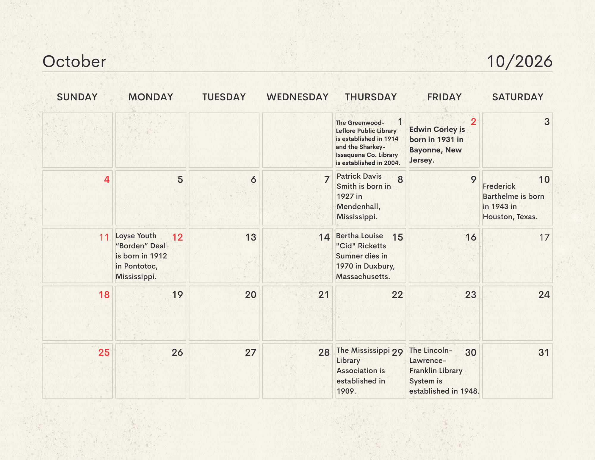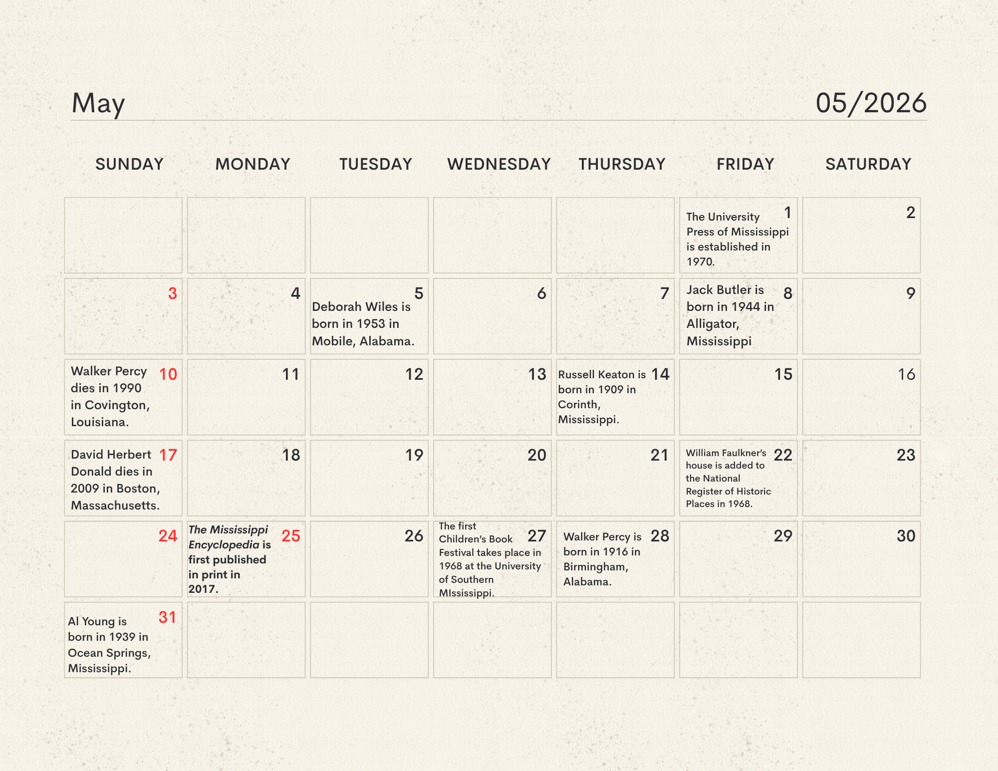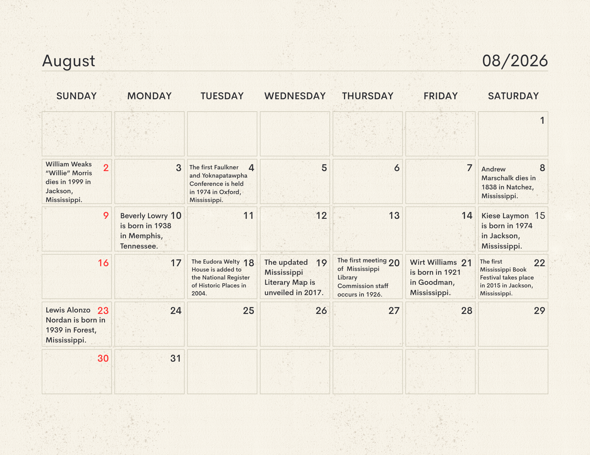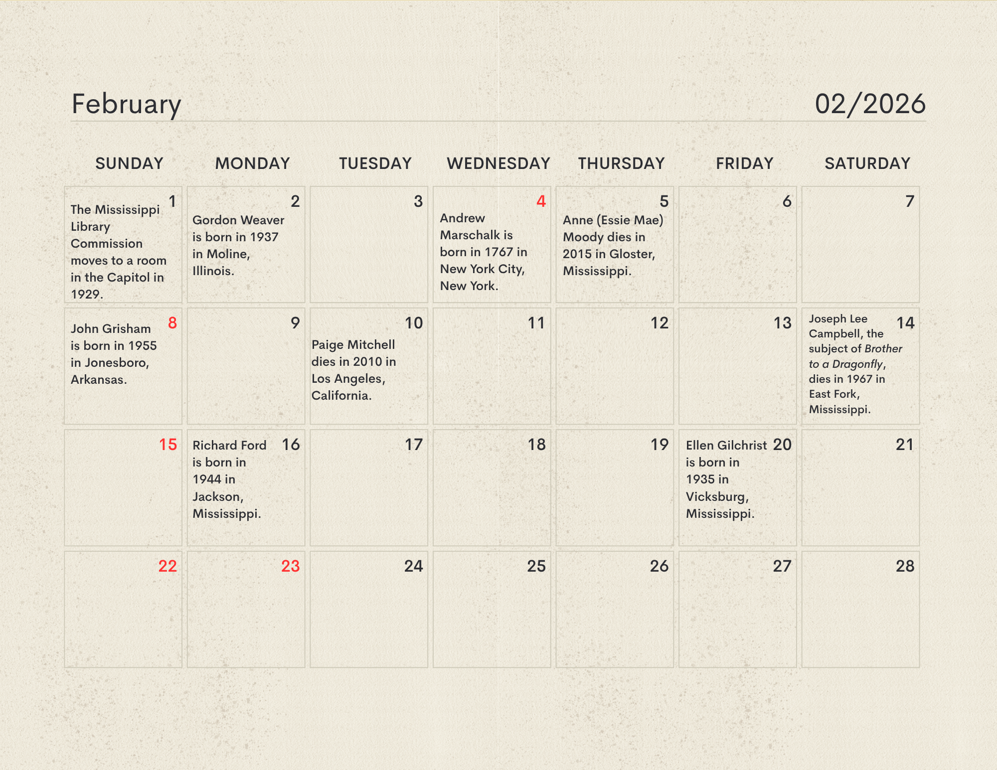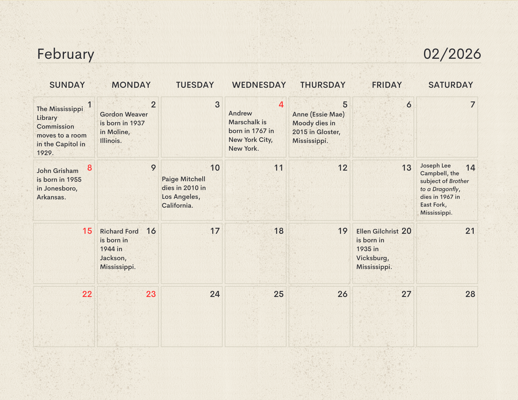 The MLC Center for the Book developed the Mississippi Readers Calendar as a way to mark notable dates from Mississippi’s rich literary history, which is still being built today. The Mississippi Library Commission supports a love of reading in a myriad of ways, from connecting readers to audiobooks and Braille through our Talking Books Services, supporting the collections of Mississippi libraries through our Primary Resource Library, and providing access to services like hoopla and MAGNOLIA for all Mississippians. Our Center for the Book is another avenue for supporting and encouraging literacy, a love of reading, and the use of public libraries. The authors, innovators, and historic happenings noted in this calendar have all contributed to our state’s literary history and paved the way for the literary leaders of tomorrow. We didn’t have room for every literary event in our state’s history, so feel free to print a copy of the calendar and add your own! Click here to download the calendar.