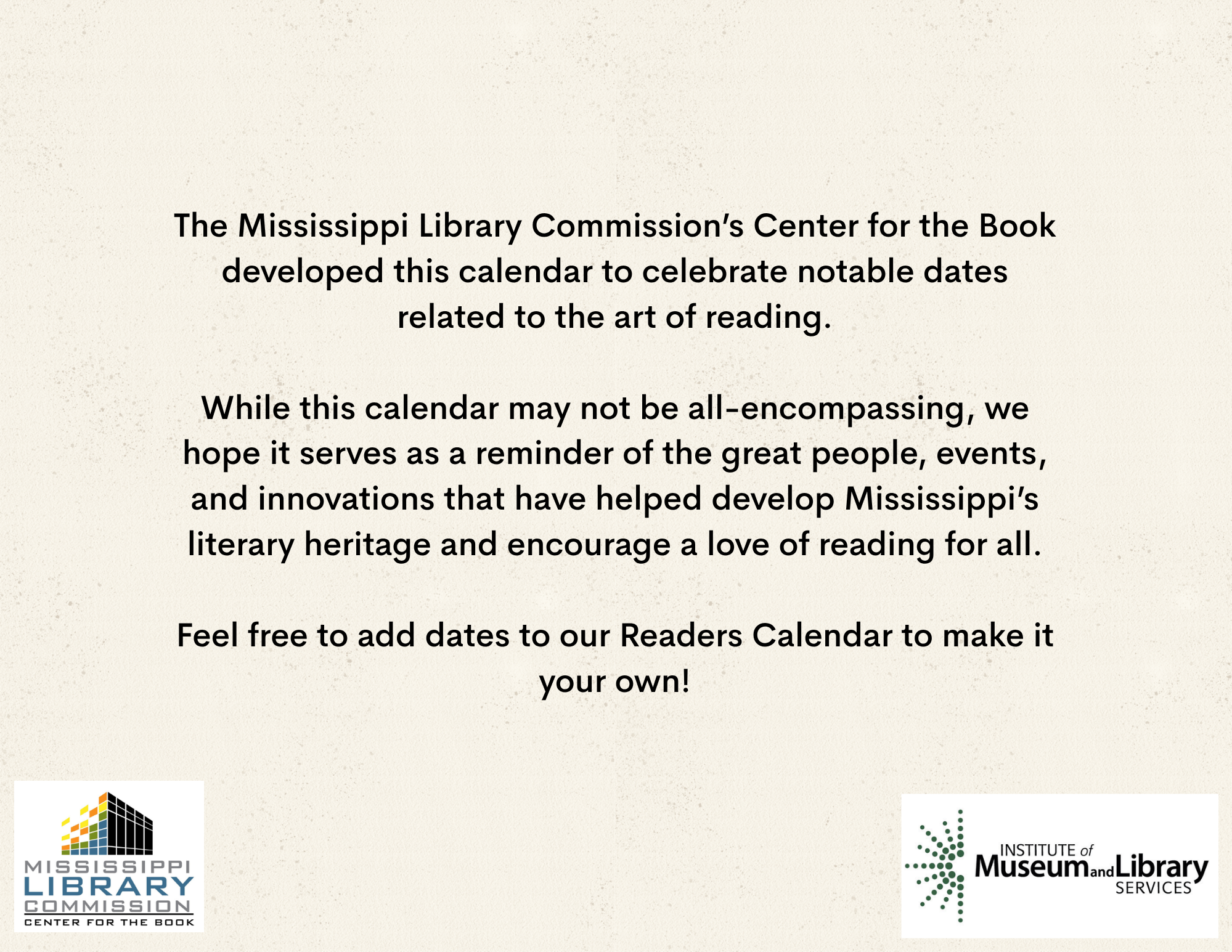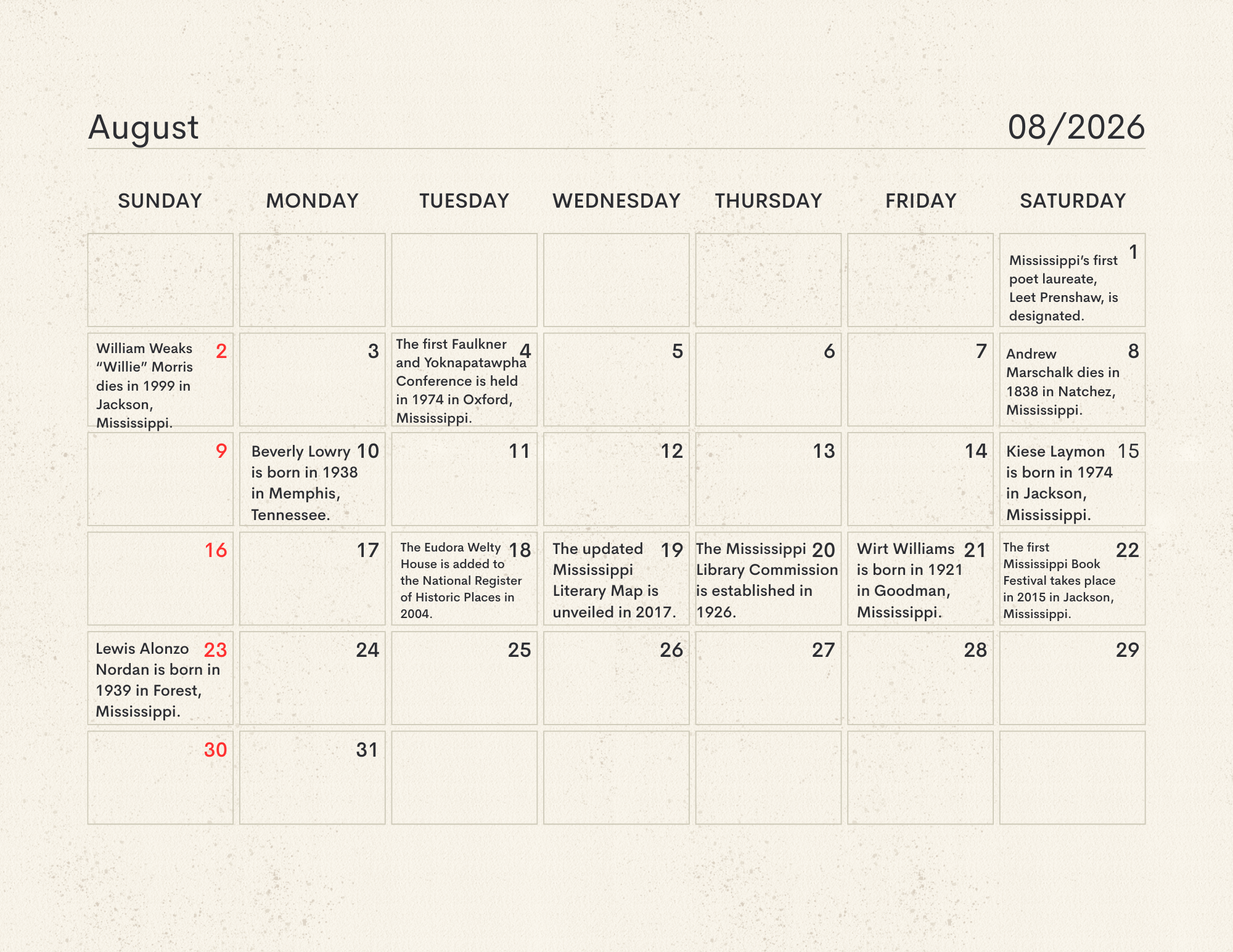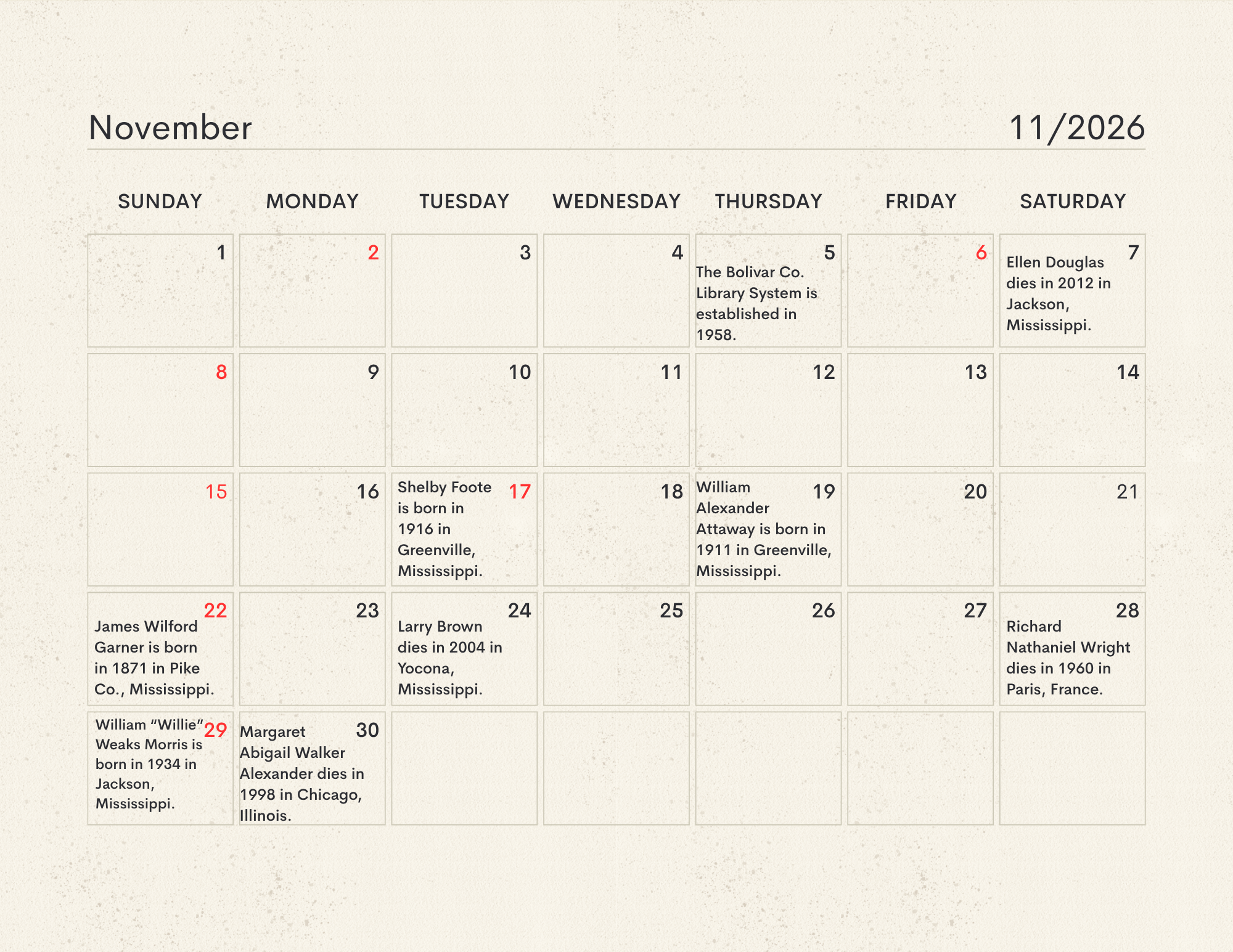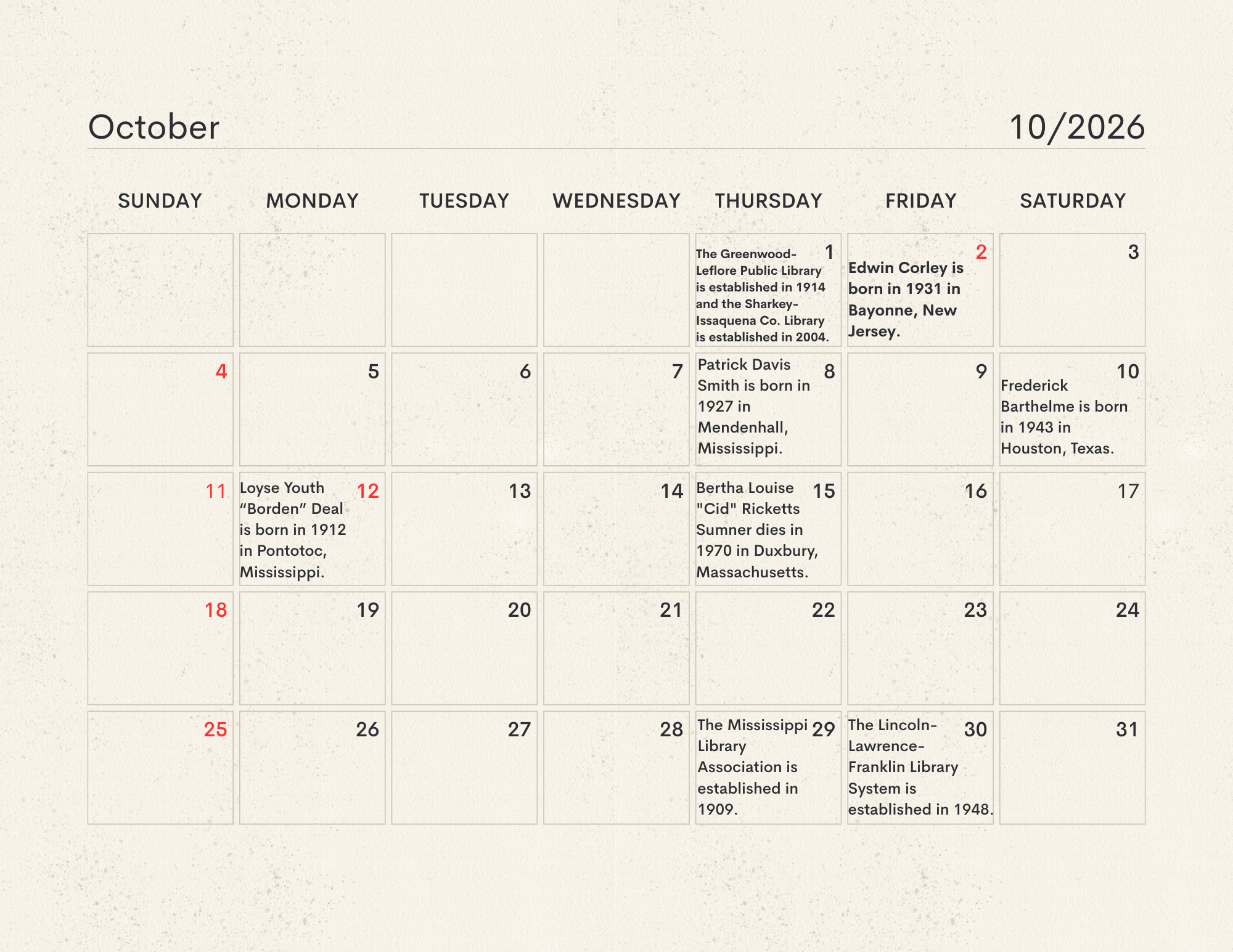 The MLC Center for the Book developed the Mississippi Readers Calendar as a way to mark notable dates from Mississippi’s rich literary history, which is still being built today. The Mississippi Library Commission supports a love of reading in a myriad of ways, from connecting readers to audiobooks and Braille through our Talking Books Services, supporting the collections of Mississippi libraries through our Primary Resource Library, and providing access to services like hoopla and MAGNOLIA for all Mississippians. Our Center for the Book is another avenue for supporting and encouraging literacy, a love of reading, and the use of public libraries. The authors, innovators, and historic happenings noted in this calendar have all contributed to our state’s literary history and paved the way for the literary leaders of tomorrow. We didn’t have room for every literary event in our state’s history, so feel free to print a copy of the calendar and add your own! Click here to download the calendar.