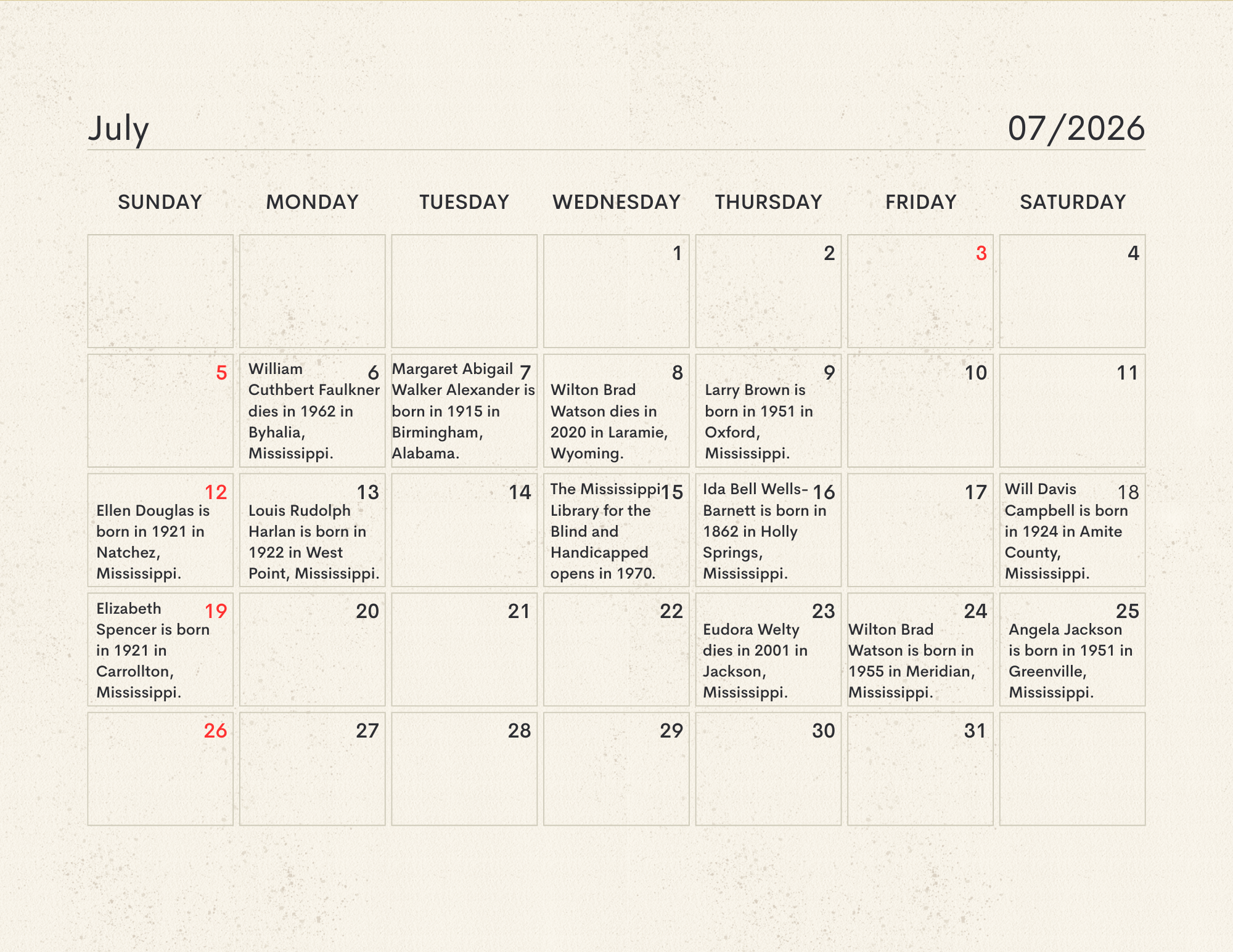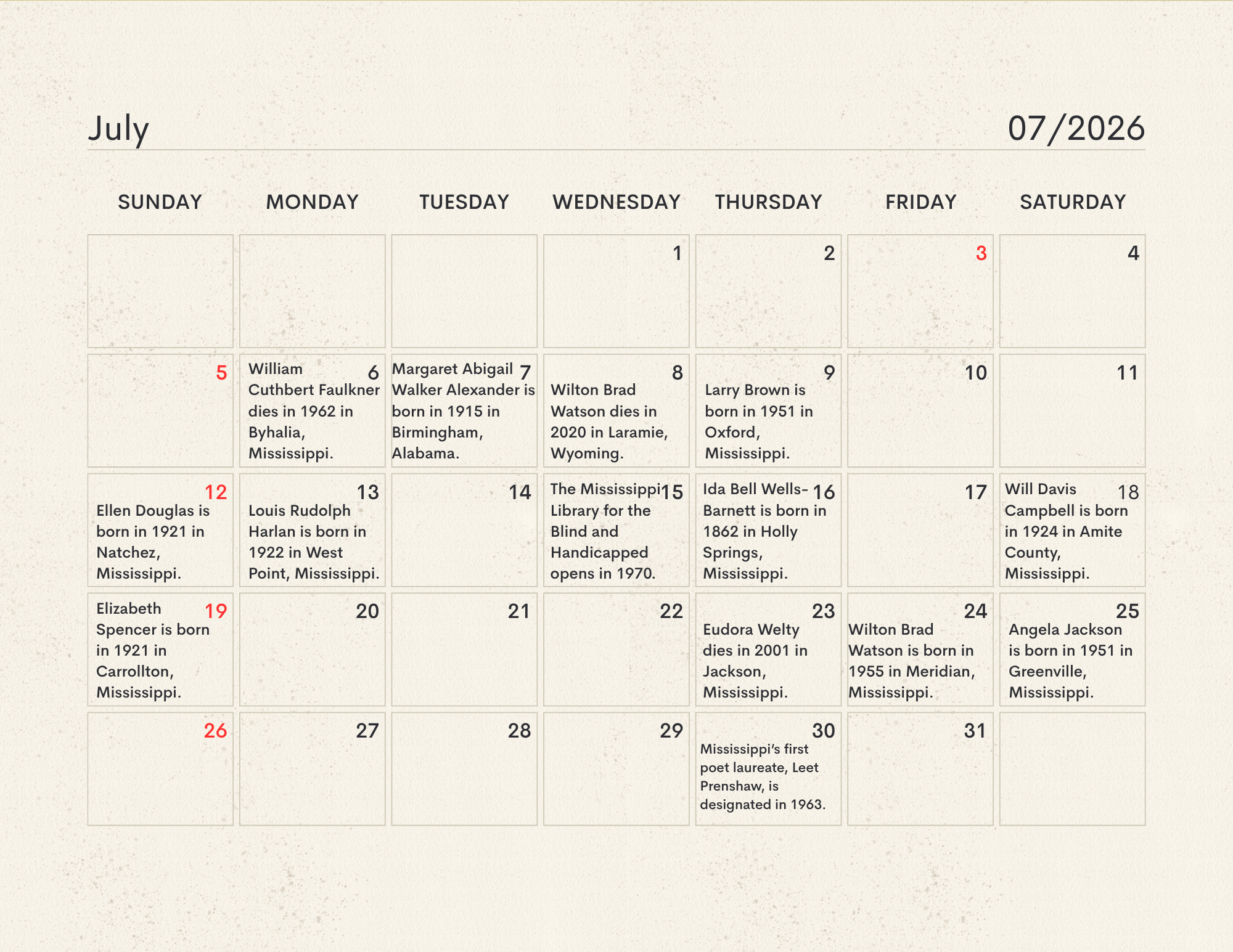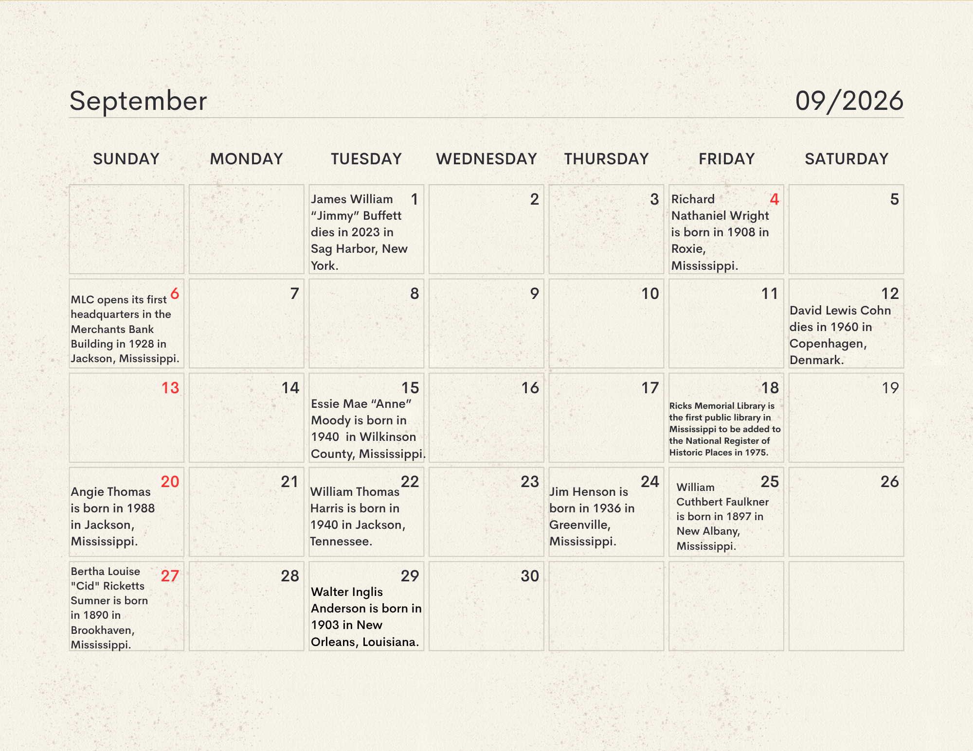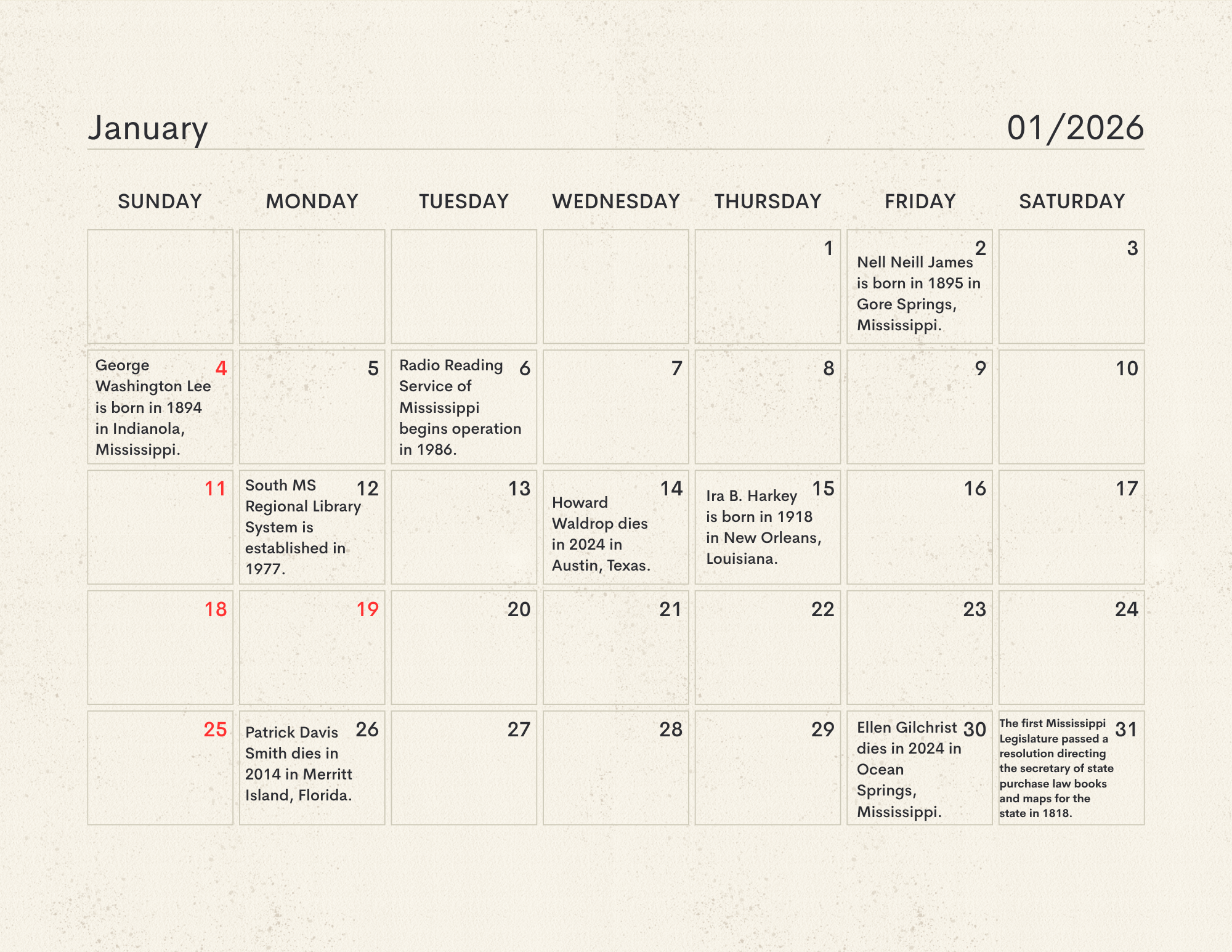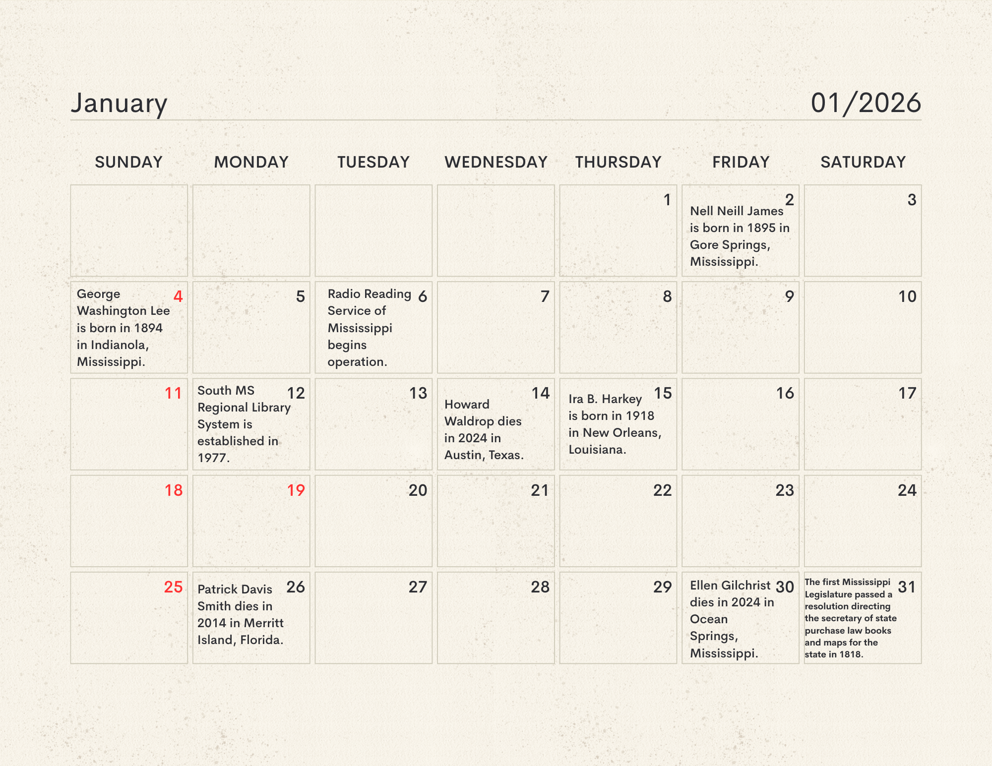 The MLC Center for the Book developed the Mississippi Readers Calendar as a way to mark notable dates from Mississippi’s rich literary history, which is still being built today. The Mississippi Library Commission supports a love of reading in a myriad of ways, from connecting readers to audiobooks and Braille through our Talking Books Services, supporting the collections of Mississippi libraries through our Primary Resource Library, and providing access to services like hoopla and MAGNOLIA for all Mississippians. Our Center for the Book is another avenue for supporting and encouraging literacy, a love of reading, and the use of public libraries. The authors, innovators, and historic happenings noted in this calendar have all contributed to our state’s literary history and paved the way for the literary leaders of tomorrow. We didn’t have room for every literary event in our state’s history, so feel free to print a copy of the calendar and add your own! Click here to download the calendar.