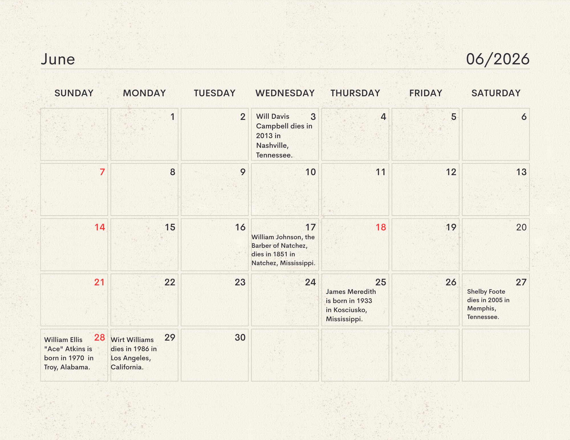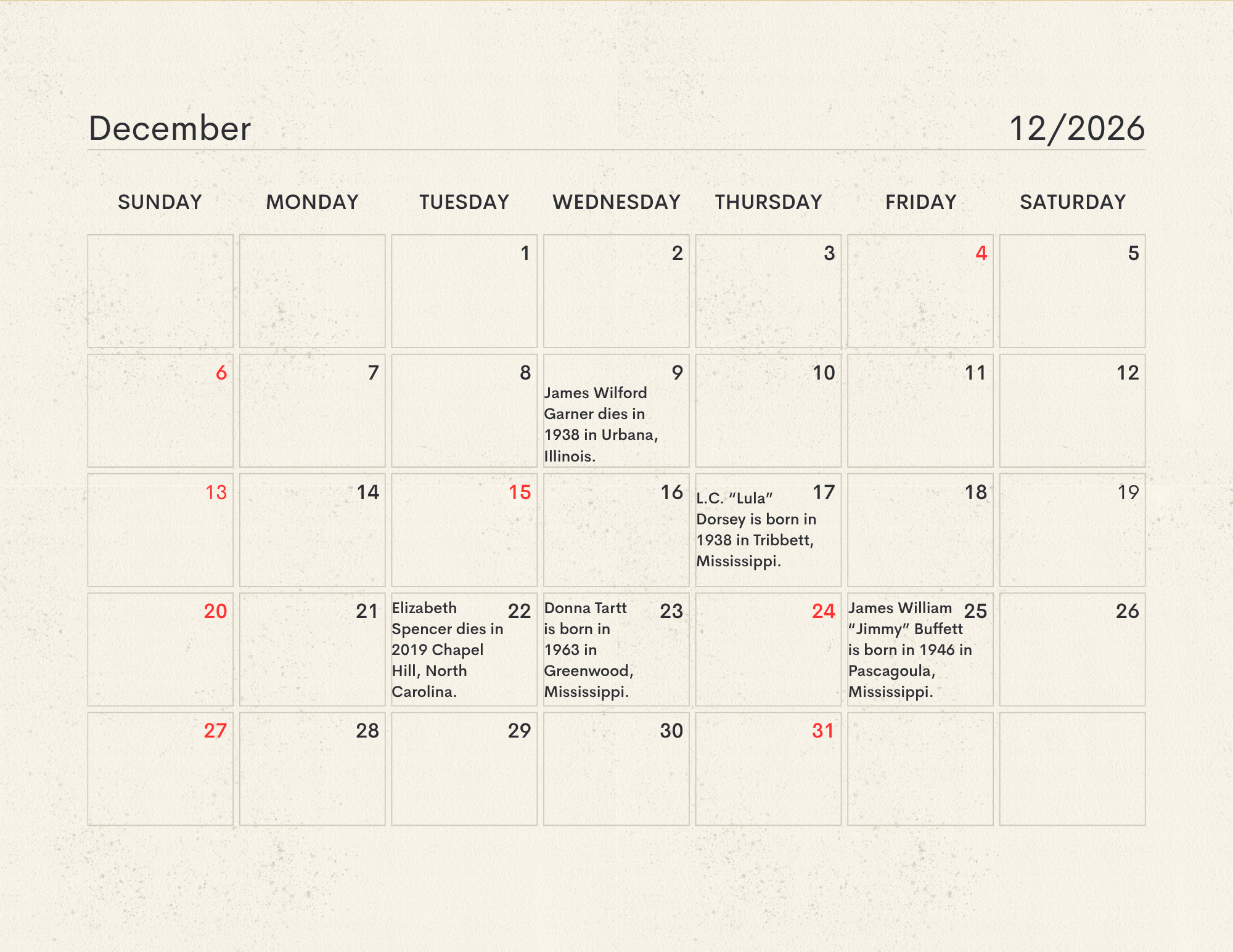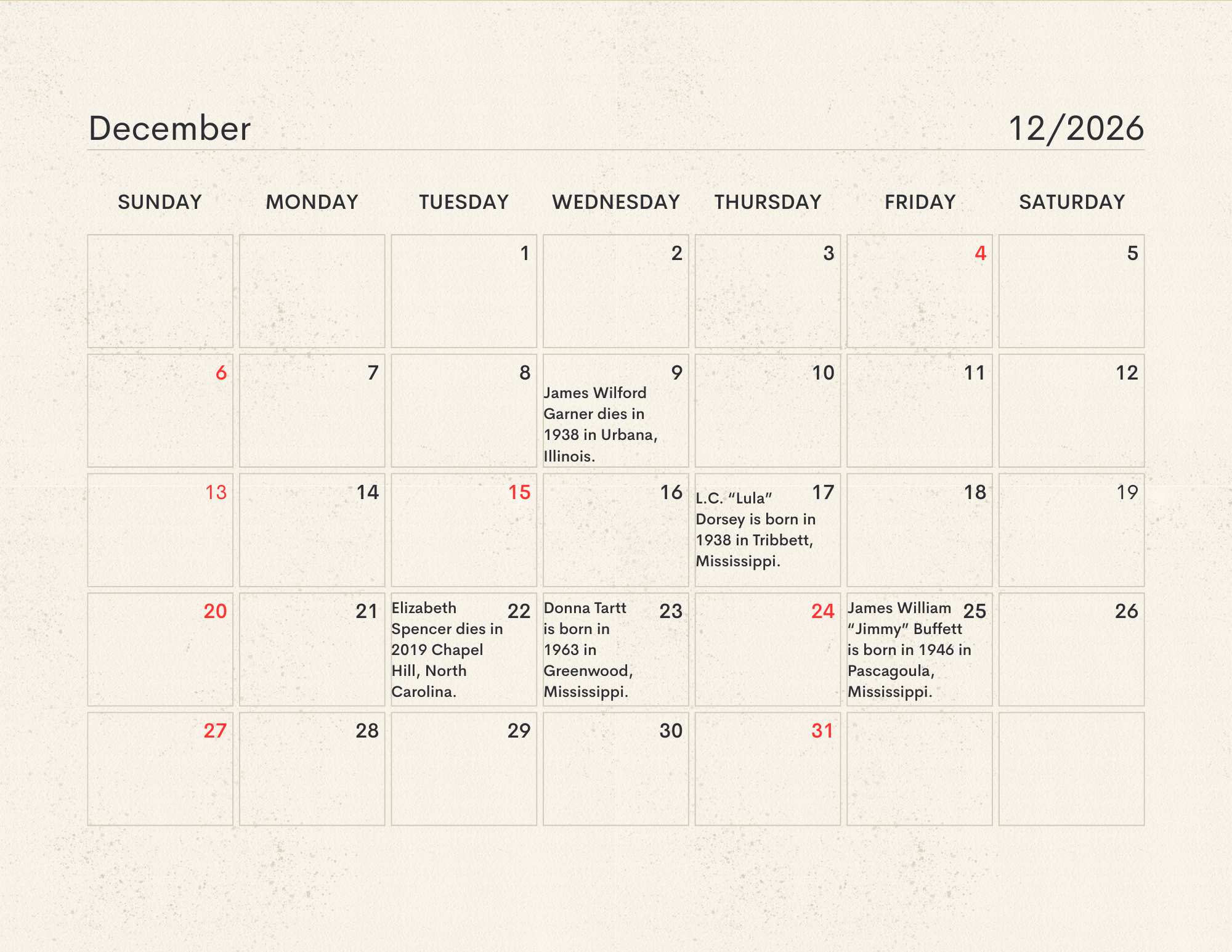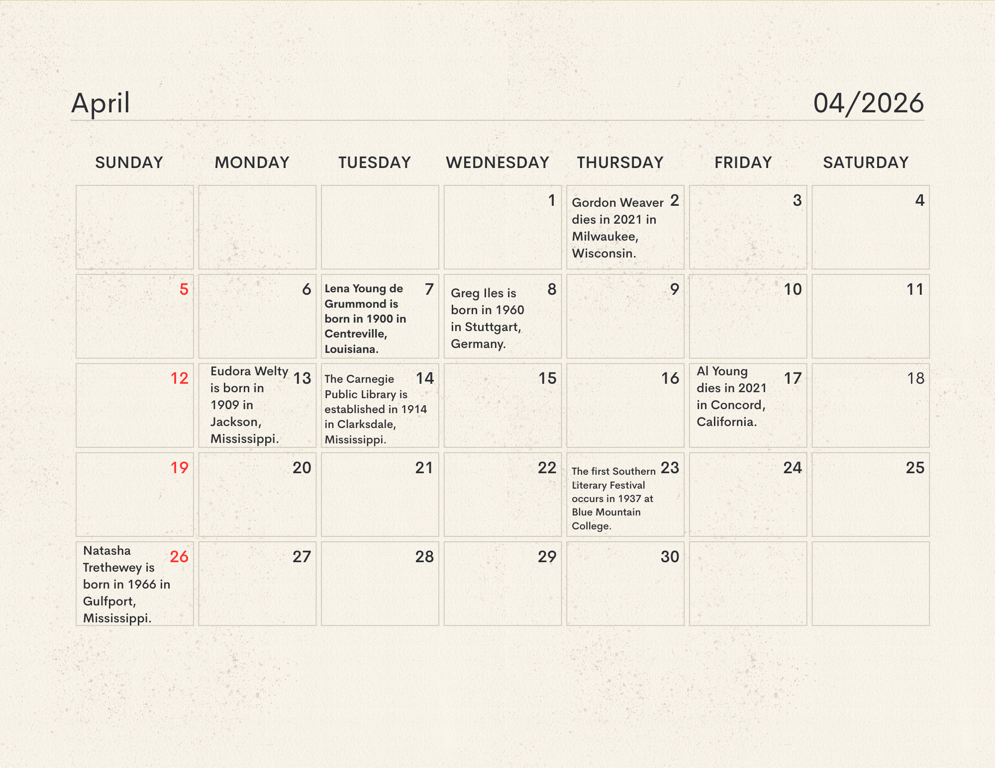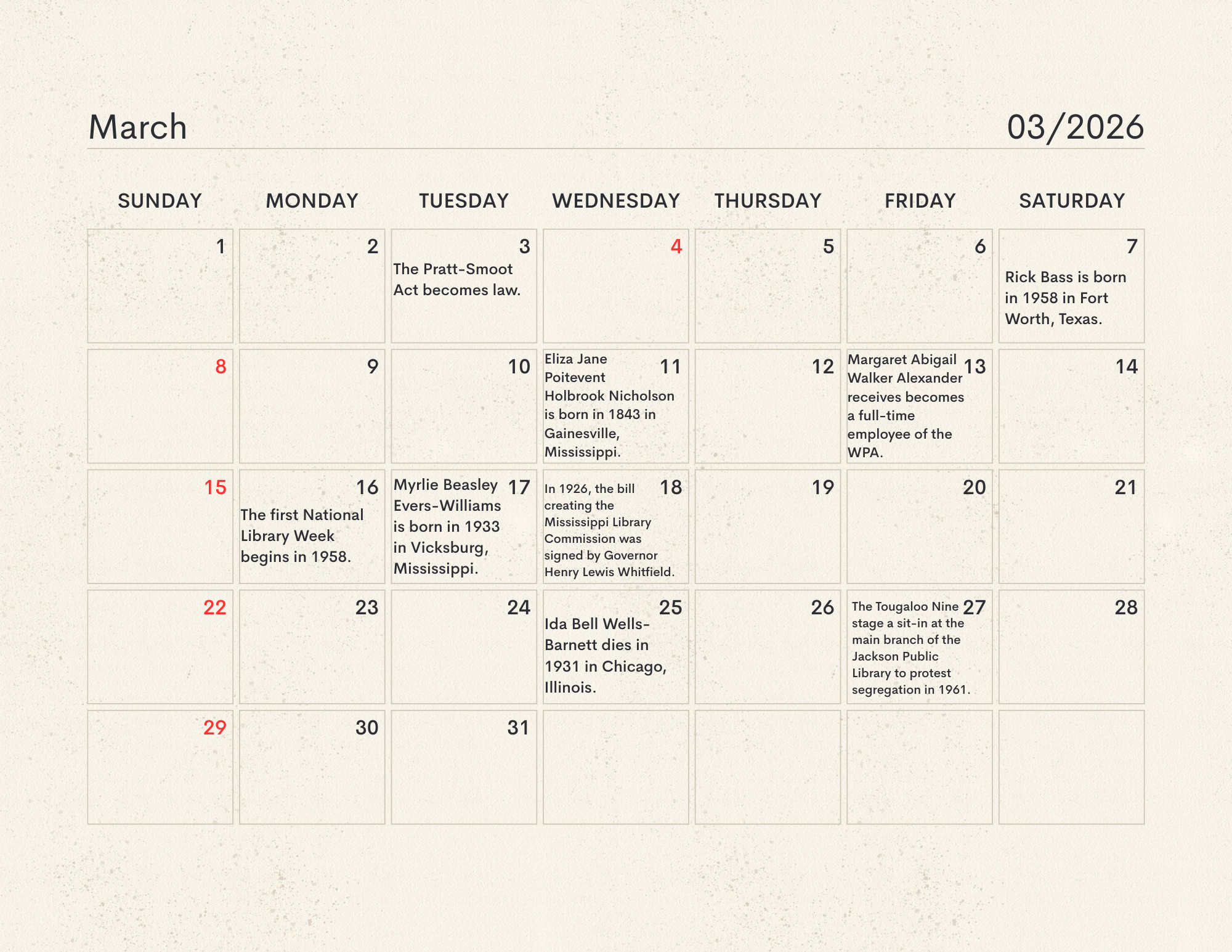 The MLC Center for the Book developed the Mississippi Readers Calendar as a way to mark notable dates from Mississippi’s rich literary history, which is still being built today. The Mississippi Library Commission supports a love of reading in a myriad of ways, from connecting readers to audiobooks and Braille through our Talking Books Services, supporting the collections of Mississippi libraries through our Primary Resource Library, and providing access to services like hoopla and MAGNOLIA for all Mississippians. Our Center for the Book is another avenue for supporting and encouraging literacy, a love of reading, and the use of public libraries. The authors, innovators, and historic happenings noted in this calendar have all contributed to our state’s literary history and paved the way for the literary leaders of tomorrow. We didn’t have room for every literary event in our state’s history, so feel free to print a copy of the calendar and add your own! Click here to download the calendar.